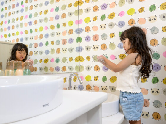 パパ・ママと一緒に小さいお子さまにも使いやすい段違いの洗面台。
