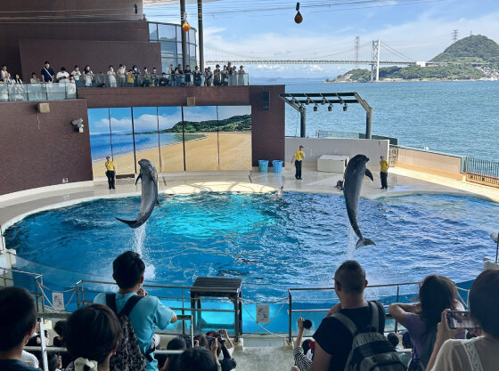 関門海峡の潮の流れを再現した水槽は迫力満点。イルカ・アシカ・ペンギンのショーは必見。
