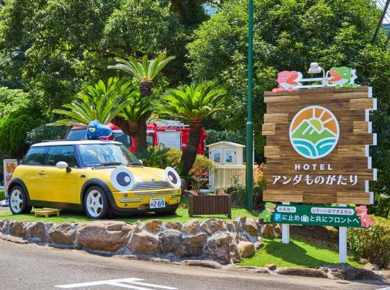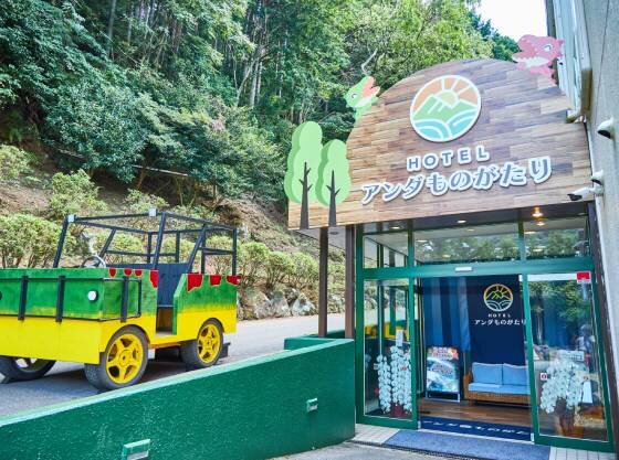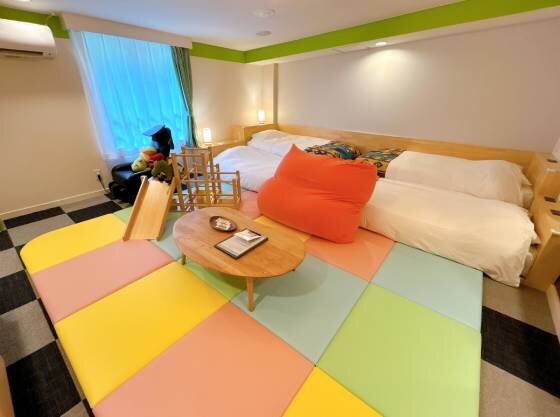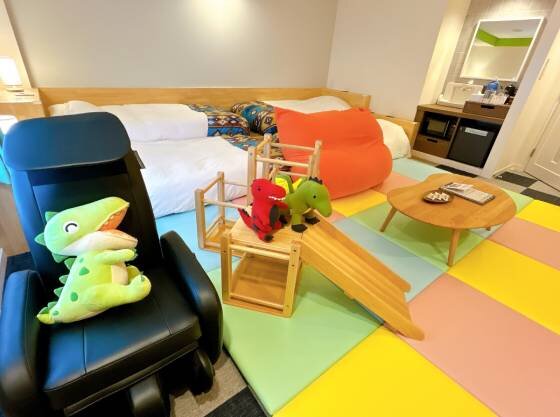 エントランスからワクワク感いっぱい、テーマパークのように楽しめるオールインクルーシブホテル。認定部屋はシングルベッドが4台、段々畑のように並んでいる最上階の広いお部屋。滑り台付きジャングルジムや木育あそびができるおもちゃが用意され、お子さまの気分があがること間違いなし。貸切露天風呂は事前予約不要のため、お子さまの機嫌や睡眠のタイミングに合わせて利用できるのがうれしい。無料アクティビティも豊富で、飽きることなく滞在を楽しめるお宿である。
