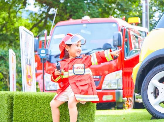 本物の消防車に乗って遊べるお子様用の遊び場。消防服のコスプレもご着用いただけます