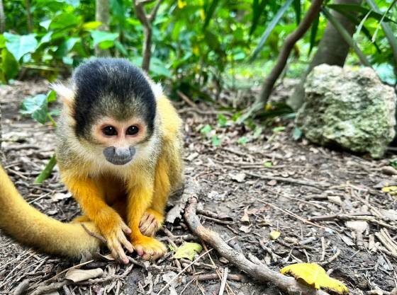 やいま村では、肩や手にリスザルが乗ってくることも。