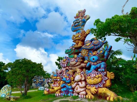 巨大でカラフルなシーサーが並ぶ米子焼シーサー農園。特別な一枚を思い出に。