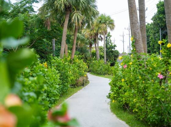 リゾートへの期待が高まる、 駐車場からホテルまでの遊歩道。